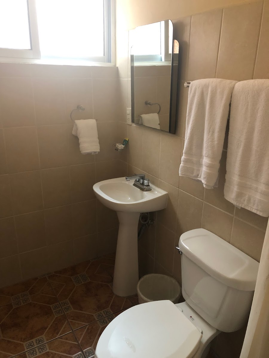 El hotel es súper limpio, ordenado y cómodo. Tiene TV, agua caliente y fría, además internet. Tiene mini split y no un ruidoso clima de ventana, además del aire acondicionado cuenta con ventiladores en la habitación, porque la zona es muy calurosa. Puedes escoger entre planta alta y planta baja. Tiene un pequeño estacionamiento pero si necesitan salir otros huéspedes hay que sacar los vehículos que estorban. La calidad es muy buena y es de un excelente precio